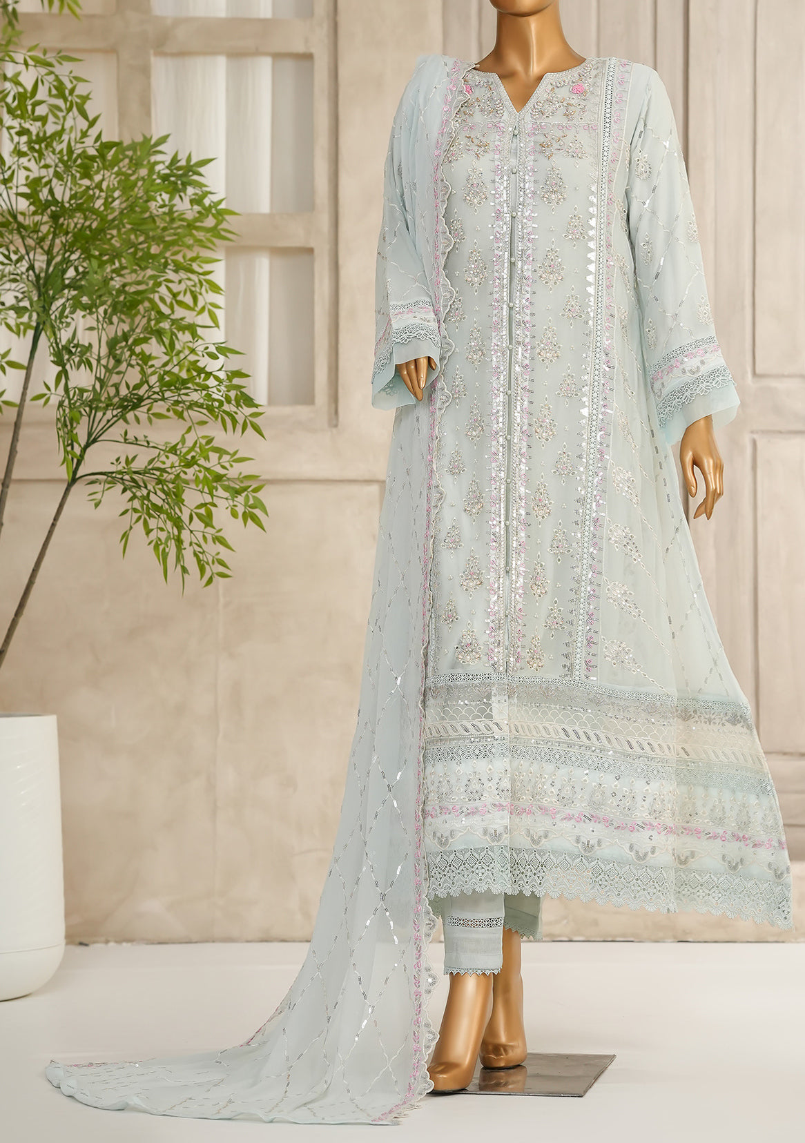 Includes: Ready-Made Kameez, Trouser, Dupatta.