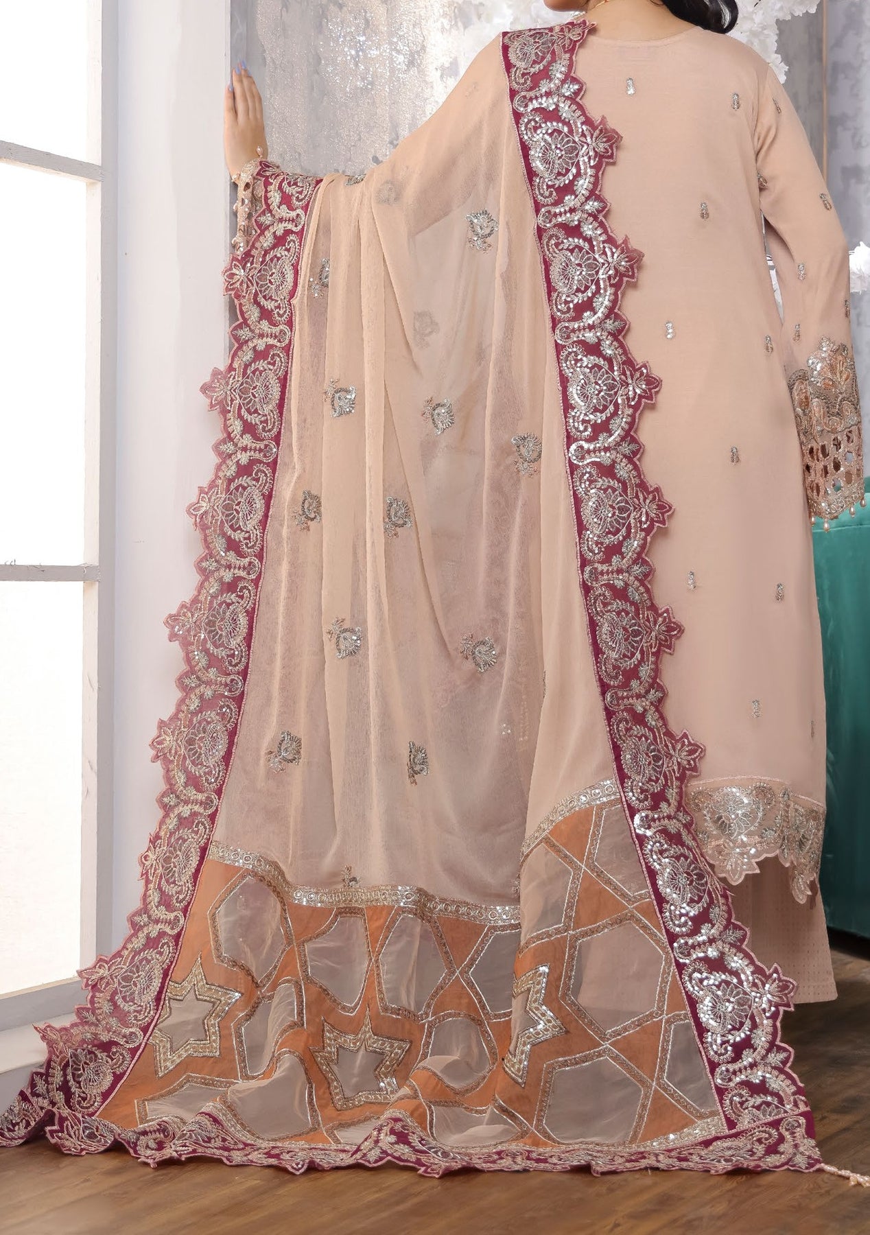 - Embroidered Chiffon Dupatta With Border Work.