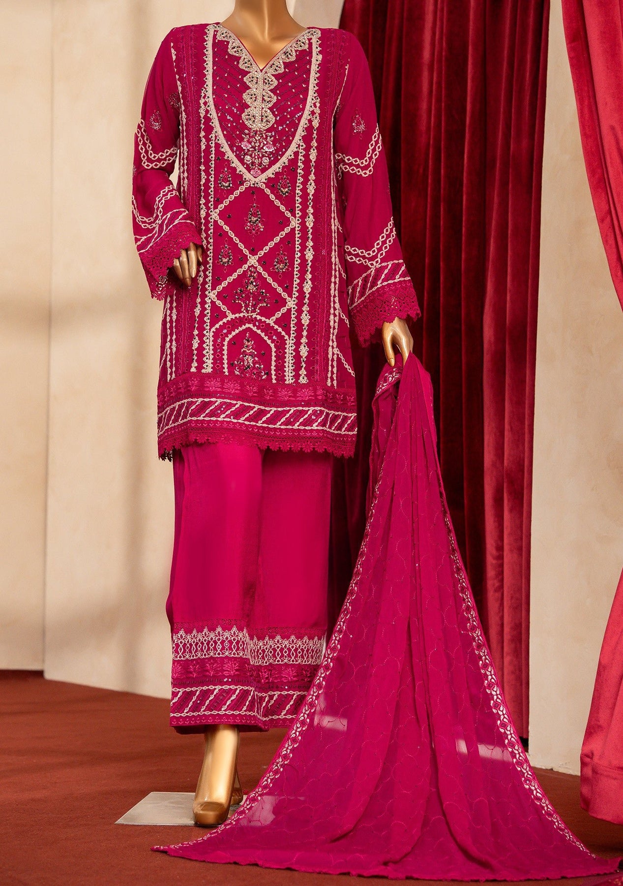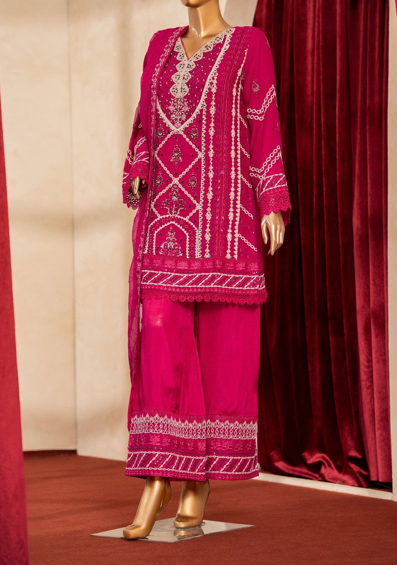 Includes: Ready-Made Kameez, Trouser, Dupatta.